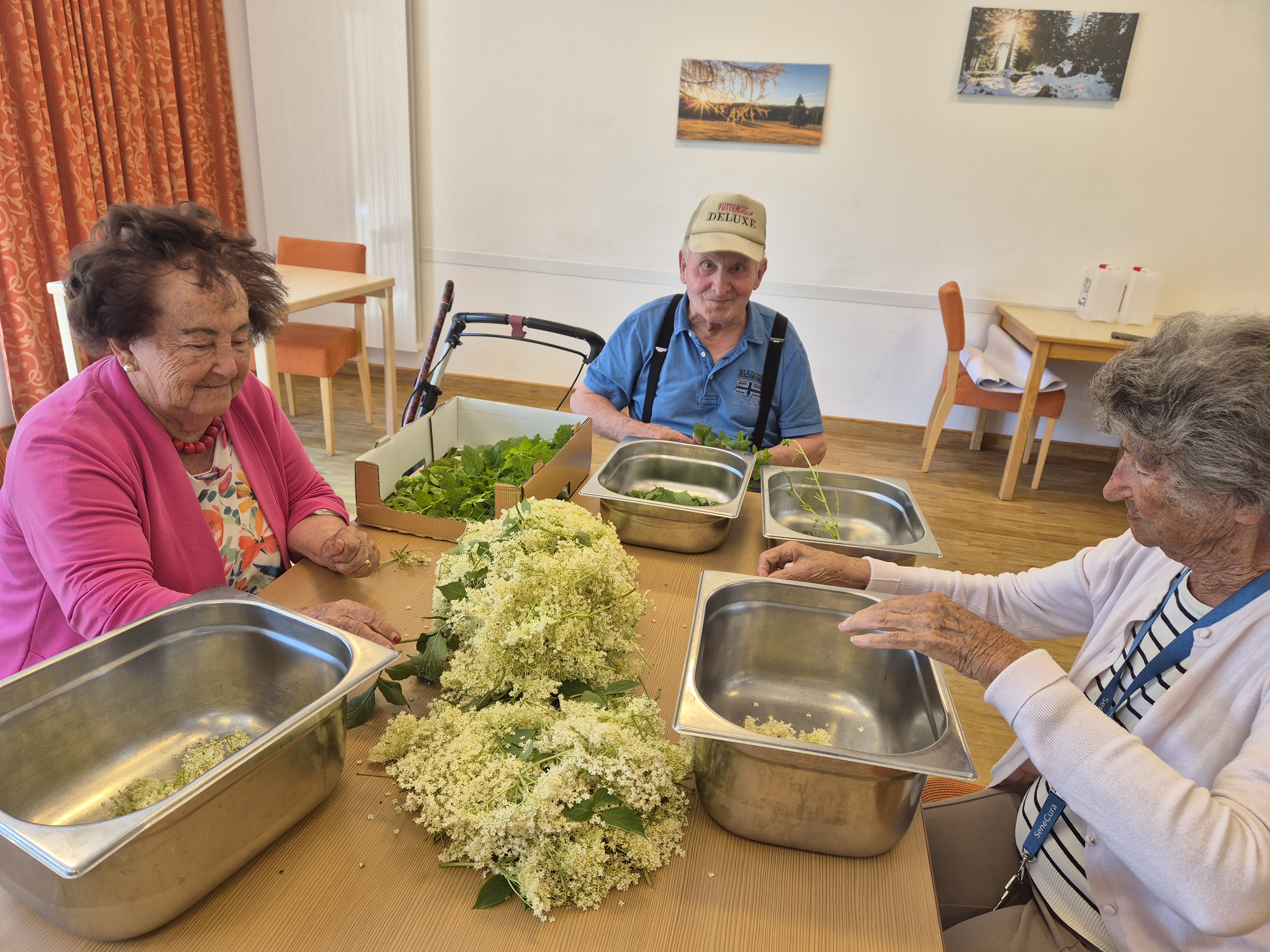 Eifrig wurden die weißen Blüten gepflückt und von den Bewohnerinnen und Bewohnern anschließend verarbeitet. In einer netten Gruppe wurden die Blüten von den Stängeln gezupft und die Orangen in Scheiben geschnitten. Die Citrusfrucht verleiht dem Hollersirup eine ganz besondere Note und versichert, dass dieser köstlich wird.